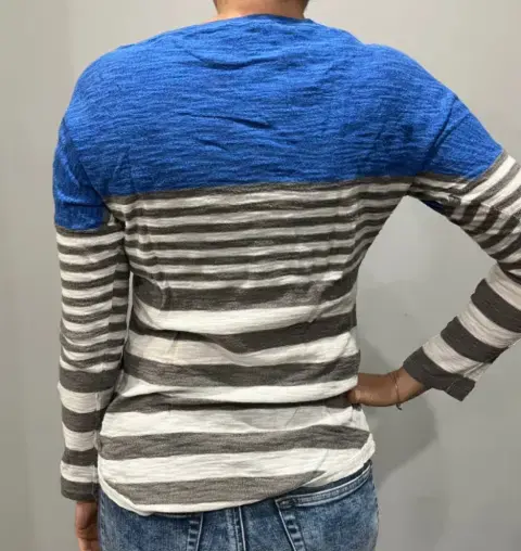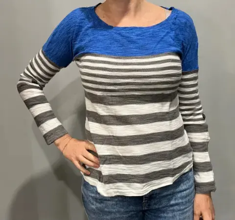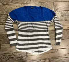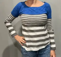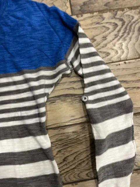 Hermosa playera de rayas grises blancas y azul marino Talla s48cm de axila a axila De la marca Express, es manga larga pero tiene botones en la manga para hacer manga 3/4