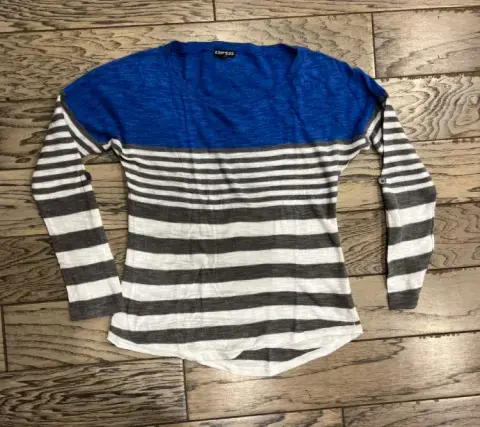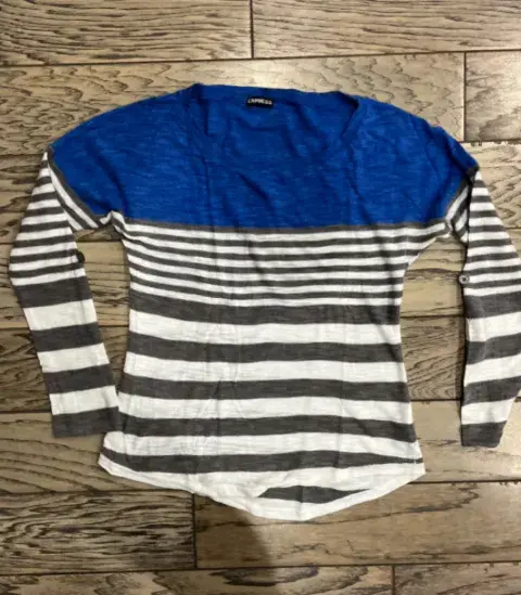 Playera express de rayas. Hermosa playera de rayas grises blancas y azul marino Talla s48cm de axila a axila De la marca Express, es manga larga pero tiene botones en la manga para hacer manga 3/4