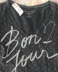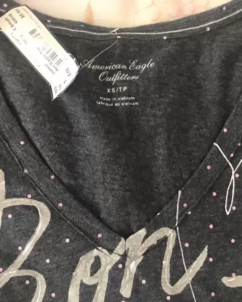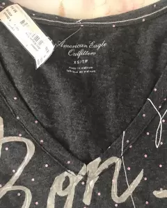 Playera American Eagle, color gris con diseño de puntos rosas, cuello en V, la tela de algodón suave y estira, manga corta, marcado como Xs, 39cm axila axila, 40cm hombro hombro, 65cm largo,