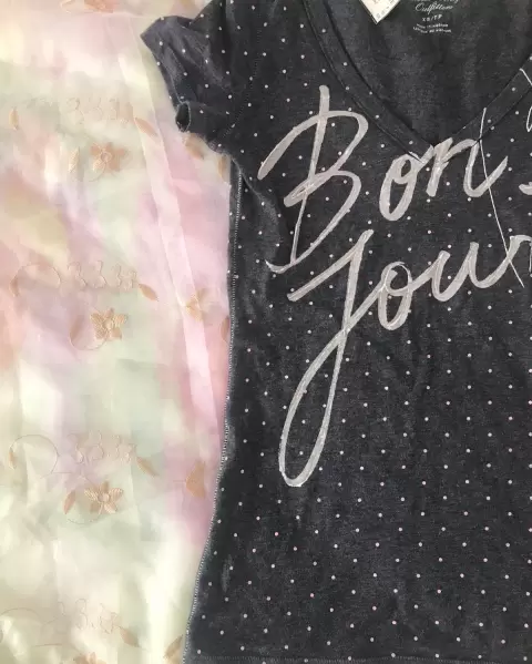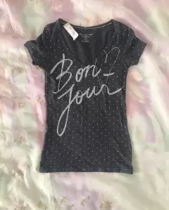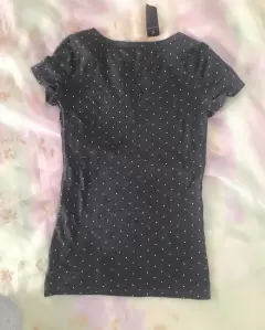 Playera gris puntos rosas Xs. Playera American Eagle, color gris con diseño de puntos rosas, cuello en V, la tela de algodón suave y estira, manga corta, marcado como Xs, 39cm axila axila, 40cm hombro hombro, 65cm largo,