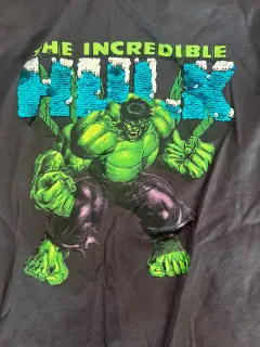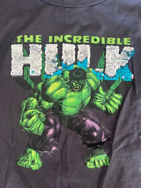 Playera de algodón de manga larga, talla 7-8 para niña o niño, con estampado de Hulk y letras de lentejuelas reversibles. Sin detalles, casi nueva. Línea Marvel Avengers.