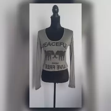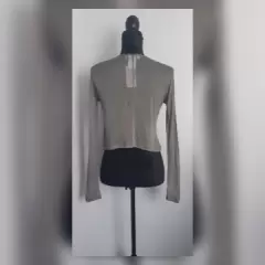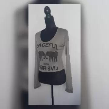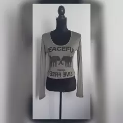 Playera cropped stretch color GRIS OXFORD, cuello joya, manga larga, estampado elefantes en zona frontal. Talla G (REDUCIDA, da mejor a M). Dimensiones cms: 51.5 hombro, 48.5 axila, 46.5 zona baja, 44 largo, 53 largo manga. 100% liocel. Para lavado en casa.