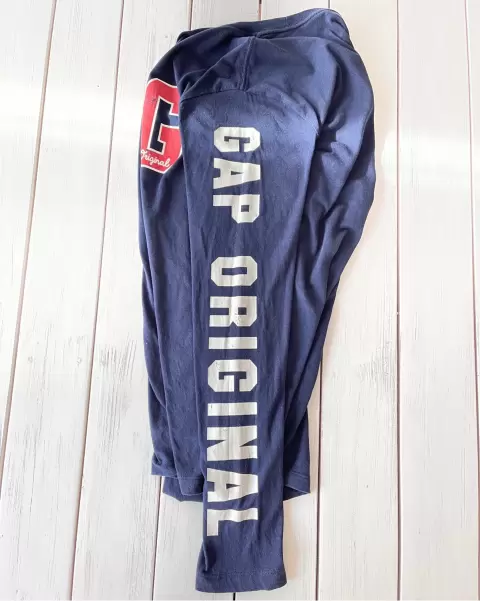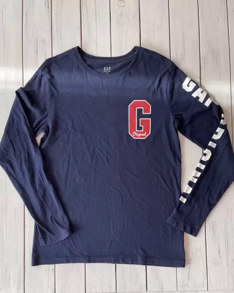 Playera ligera Gap. Playera muy suave azul marino con estampado al frente y en la manga izquierda. Es amplia y ligera. Tiene detalles en el estampado y los colores se pueden ver distintos por la luz natural.Talla: XS Medidas: 45.5 cm hombros, 47.5 cm axila y 66 cm largo.