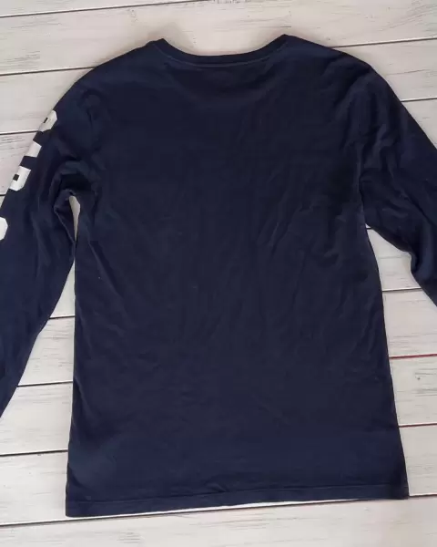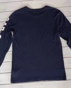 Playera muy suave azul marino con estampado al frente y en la manga izquierda. Es amplia y ligera. Tiene detalles en el estampado y los colores se pueden ver distintos por la luz natural.Talla: XS Medidas: 45.5 cm hombros, 47.5 cm axila y 66 cm largo.