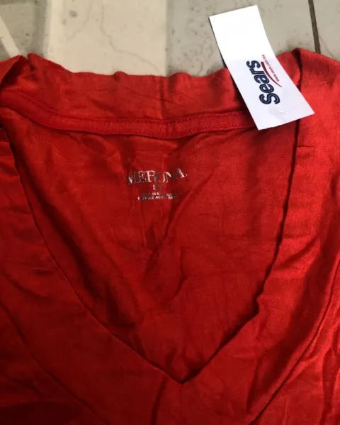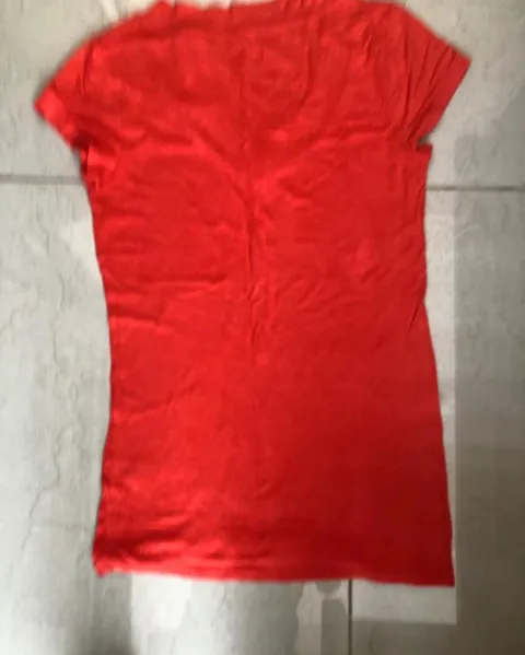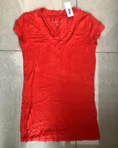Playera de dama color naranja, tela tipo lycra, cuello V, marca MERONA, con etiqueta, talla S