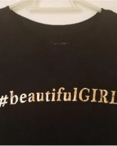 SUAVE Y COMODA PLAYERA CASUAL NEGRA DE ALGODON CON LIKRA!!ESTAMPADO DE LETRAS EN COLOR ORO ROSADO DE HASHTAG: BEAUTIFUL GIRL / UNITALLA QUEDA A 7,9,11/.LICKRA SUAVE COMODA !