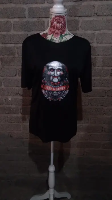 Playera negra en talla L de algodón con licra con estampado de saw juego del miedo, manga arriba del codo solo nos queda 1 pieza totalmente nuevo