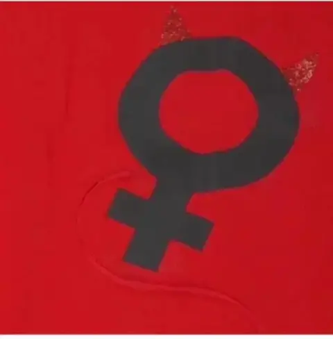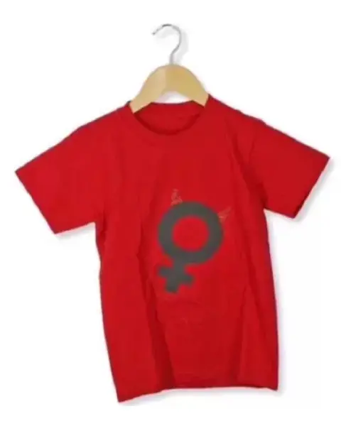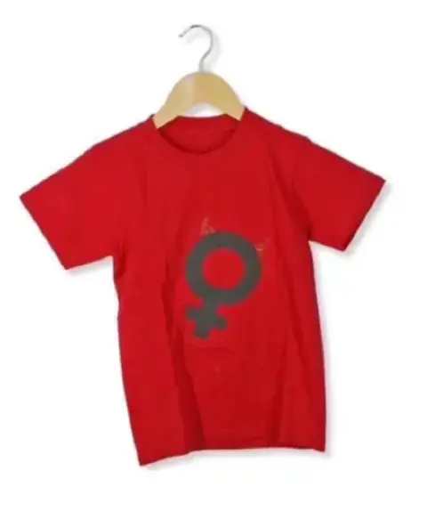 Playera roja con símbolo y cuernitos diablito, tiene un acolita calada para verse la piel la impresión es vinil planchado, en la parte de atrás tiene dos alas calada para que se que deja al descubierto la espalda. Muy linda y única