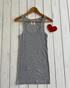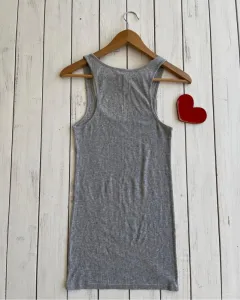 Talla: S Medidas 34 cm de axila y 68.5 cm de largo.Playera gris sin manga, acanalada, es stretch y queda justa.