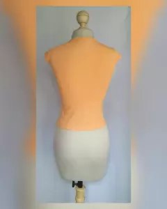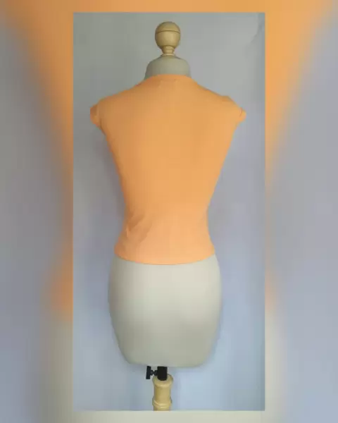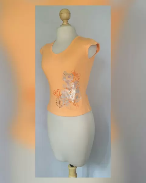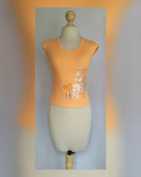 Playera en tejido de punto color DURAZNO, cuello redo, manga casquillo y estampado floral frontal en tonos naranja y plata metálico. Talla G (reducida, da mejor a M). Dimensiones cms: 35.5 hombro, 38.5 axila, 35 cintura, 41 zona baja, 49.5 largo, 4.5 largo manga. 95% algodón, 5% elastano. P/lavado en casa. ***SIN DETALLES, se uso solo una vez p/un par de hrs***SE ENTREGA LAVADA Y DEODORIZADA***