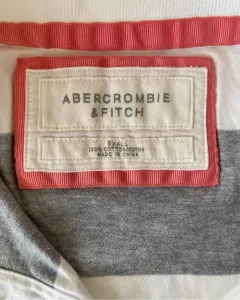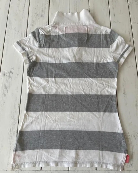 Playera tipo polo a rayas Abercrombie & Fitch. 100% algodón, talla: S, manga corta, a rayas gris con blanco y detalles en rosa, 59 cm de largo, 38.5 cm de axila, 32.5 cm de hombro. En la última foto se ve la pequeña mancha en el cuello.