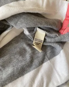 100% algodón, talla: S, manga corta, a rayas gris con blanco y detalles en rosa, 59 cm de largo, 38.5 cm de axila, 32.5 cm de hombro. En la última foto se ve la pequeña mancha en el cuello.