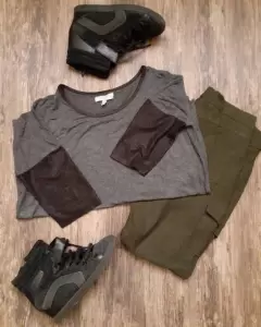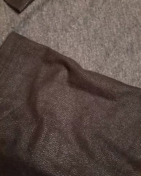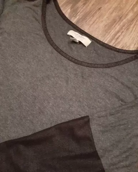 Playera gris oscuro marca Zara, manga 3/4. Tela muy fluida, el detalle de las mangas es una tela que al tacto se siente como terciopelo pero se ve como si fuera textura o estampado animal print. Talla M.