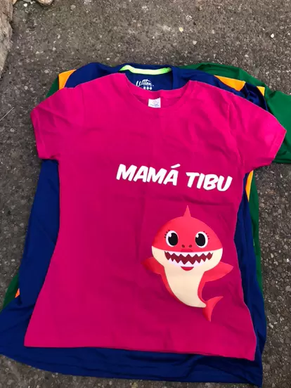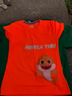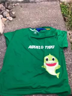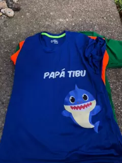 Set de playeras temáticas tiburón. Set de 6 playeras, 2 abuela tibu, 2 abuelo tibu, 1 papá tibu, 1 mamá tibu , las playeras de los abuelos y papá son talla xl, abuelas g, mamá m, todas son dry fit excepto la de mamá que es de algodón.