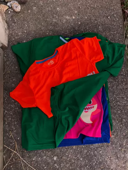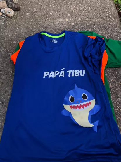 Set de 6 playeras, 2 abuela tibu, 2 abuelo tibu, 1 papá tibu, 1 mamá tibu , las playeras de los abuelos y papá son talla xl, abuelas g, mamá m, todas son dry fit excepto la de mamá que es de algodón.