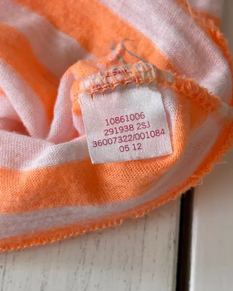 Talla: XSPlayera hecha en algodón y poliéster con espalda racerback a rayas blancas y naranja (el naranja se puede ver más fuerte en las fotos). Medidas: 33 cm de axila y 68 cm largo.