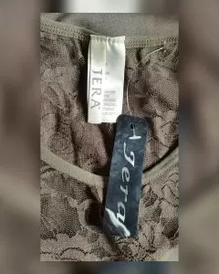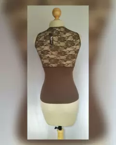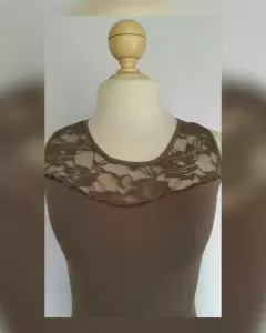 Tank top color TOPO (café verdoso) c/aplique de encaje en zonas pecho y espalda, cuello redondo y manga sisa. UNITALLA (da a M/L). Dimensiones cms: 30 hombro, 37 axila, 38 zona baja, 55 largo. 95% poliéster, 5% elastano. P/lavado en casa.***POR LA COMPOSICIÓN DE LA PRENDA, ES STRETCH***
