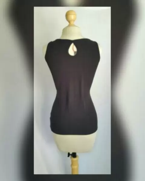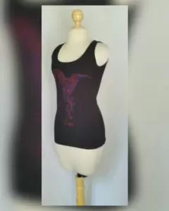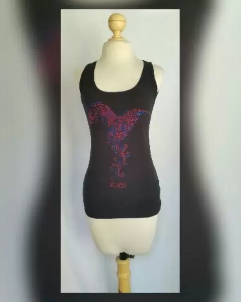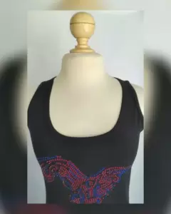 Tank Top c/Aplique Bisutería. Tank top color NEGRO ÉBANO c/aplique bisutería tono AZUL ROYAL/FUCSIA modelo COLIBRÍ TRIBAL, cuello redondo y manga sisa. Talla XXL (REDUCIDA, da mejor a XL. Dimensiones cms: 28 hombro, 46 axila, 42 cintura, 48 zona baja, 60 largo. 98% algodón, 2% elastano. Para lavado en casa.