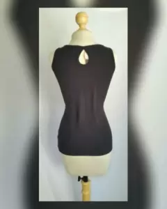 Tank top color NEGRO ÉBANO c/aplique bisutería tono AZUL ROYAL/FUCSIA modelo COLIBRÍ TRIBAL, cuello redondo y manga sisa. Talla XXL (REDUCIDA, da mejor a XL. Dimensiones cms: 28 hombro, 46 axila, 42 cintura, 48 zona baja, 60 largo. 98% algodón, 2% elastano. Para lavado en casa.