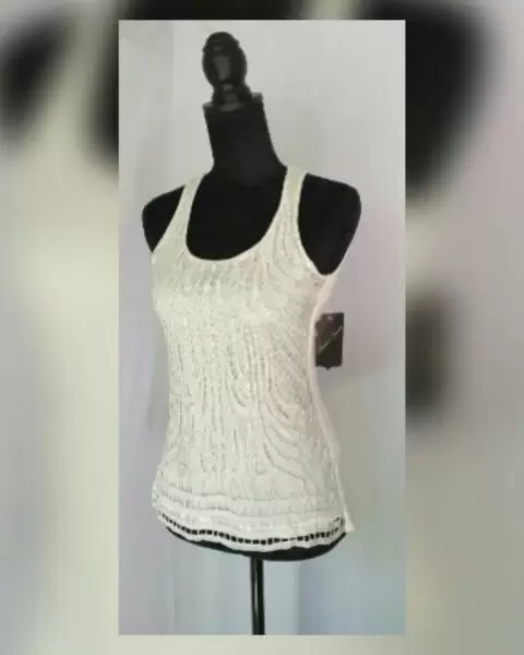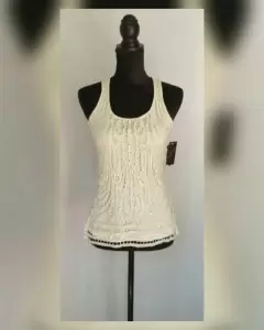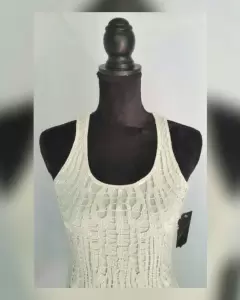 Tank top color MARFIL c/aplique frontal de croché en hilo MARFIL y PLATA, cuello redondo, manga sisa. Talla G (reducida, da a S/M). Dimensiones cms: 25 hombro, 39.5 axila, 51 zona baja, 59.5 largo. 100% poliéster. Para lavado en casa.