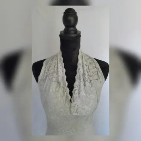 Tank Top corte Halter aplique Encaje GRIS. Tank top color GRIS SIBERIA c/ribete de encaje zona busto, corte tipo halter y copas preformadas p/mejor ajuste. Talla M. Dimensiones cms: 41 axila, 33 cintura, 41 zona baja, 60 largo. 95% algodón, 5% elastano. P/lavado en casa.***POR LA COMPOSICIÓN DE LA PRENDA ES STRETCH PERO NO COMO P/SUBIR A LA SIG TALLA***