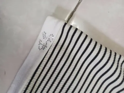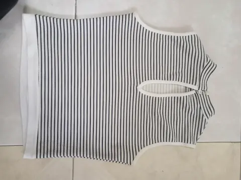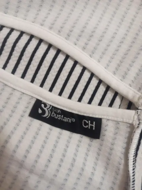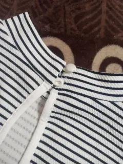 Top blanco rayas delgadas negras, se abrocha en la parte de atrás, le falta un botón en la parte de atrás, no afecta el como luce, en buenas condiciones.Tiene unos brillitos de la marca en la parte inferior izquierda, super monos.