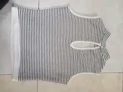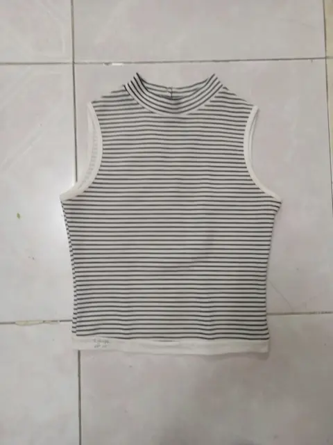 Top blanco rayas negras. Top blanco rayas delgadas negras, se abrocha en la parte de atrás, le falta un botón en la parte de atrás, no afecta el como luce, en buenas condiciones.Tiene unos brillitos de la marca en la parte inferior izquierda, super monos.