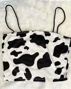 Top con estampado de vaca blanco y negro. Tela y tirantes que estiran. Talla S. Súper cómodo, lo usé dos veces. No tiene detalles.
