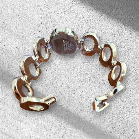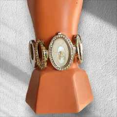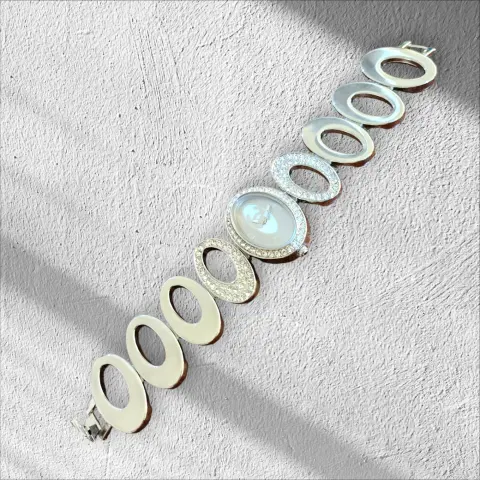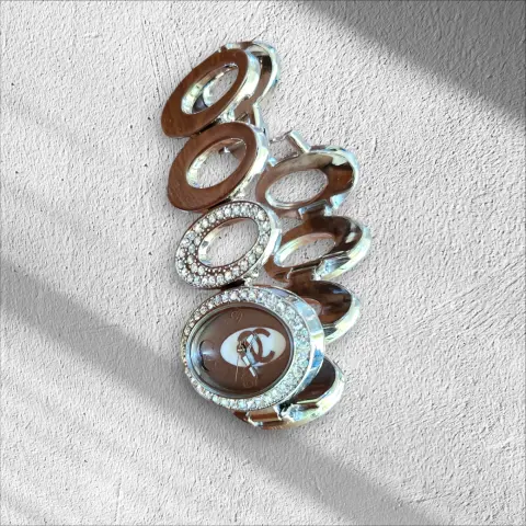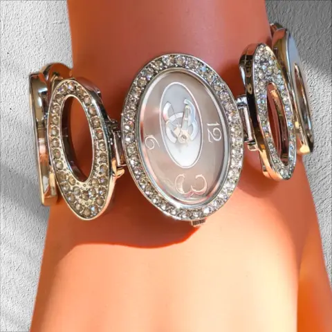 Elegante Relog Pulcera ovalado Fashion, Color plateado, con circulos diamantados en piedras blancas de fantasia, cierre de broche de precion, la caratula mide 4cm de ancho y completo 20cm hecho de acero inoxidable, nuevo a estrenar con caja para gurdar en buen estado cosmetico