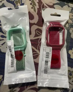 Funda con extensible para smartwatch y dos extensibles uno rosa metálico y otro azul, la medidas en la fotografía