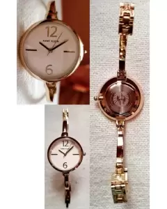 Hermoso juego reloj y pulceras Anne Klein. Lente de cristal mineral ligeramente abovedado; esfera rosa brillante con manecillas y marcadores dorados; brazalete dorado con eslabones ajustables; cierre y extensor de joyería. 3 pulseras doradas: una es de cadena, otra con esmalte rosa rubor y una pulsera con cristal premium acentuado rubor rosa esmalte pieza central. Resistente al agua. SIN DETALLES.