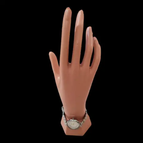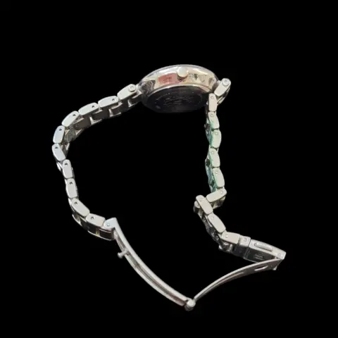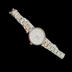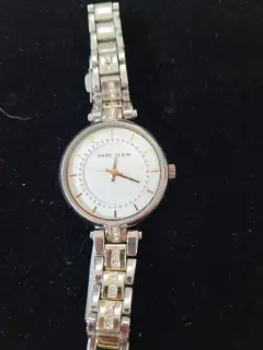 Relog Pulcera Anne Klein 😍. Relog Pulcera Anne Klein, color plateado con detalles de piedras brillantes, ajustable, doble cierre de seguridad, fondo blanco con manecillas doradas, hecho de acero inoxidable, mide 3cm de diametro con banda de 12cm, en buen estado cosmetico