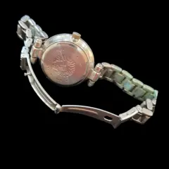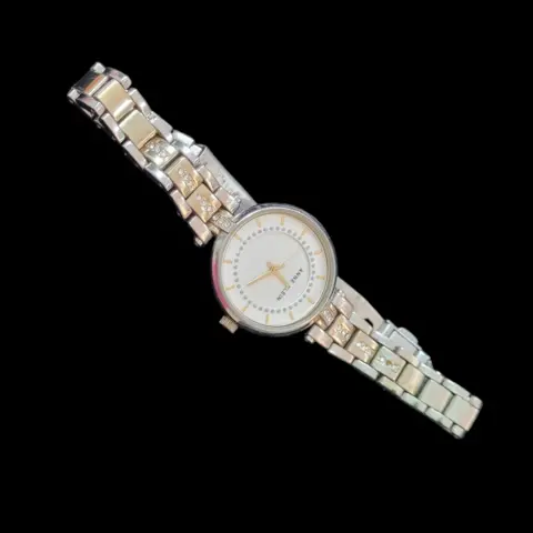 Relog Pulcera Anne Klein, color plateado con detalles de piedras brillantes, ajustable, doble cierre de seguridad, fondo blanco con manecillas doradas, hecho de acero inoxidable, mide 3cm de diametro con banda de 12cm, en buen estado cosmetico