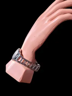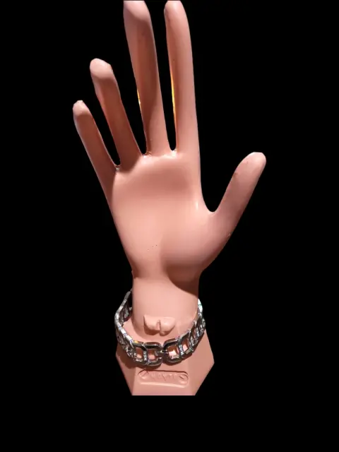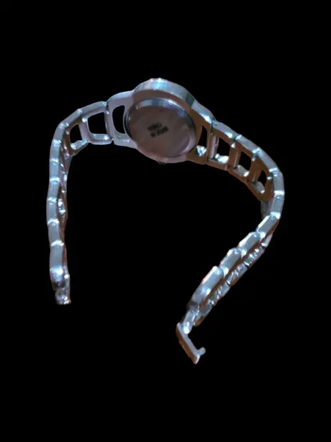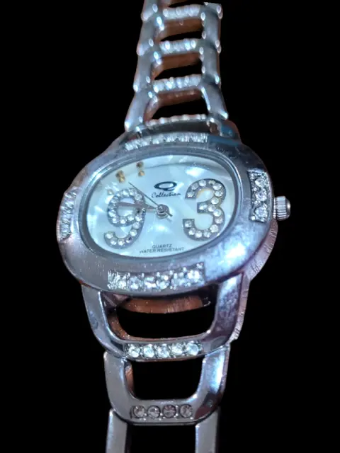 Relog Pulcera Culiver, color plata confounds blanco y piedras blancas, numeros grandes, banda de acero inoxidable con detalles de piedras brillantes, cierre de precion, 21cm de largo habierto y 8cm de diametro cerrado, trabaja con bacteria, nuevo a estrenar con cajita para guadarlo en buen estado cosmetico.