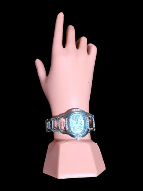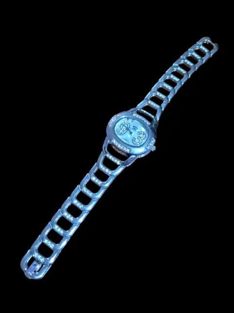 Relog Pulcera Culiver. Relog Pulcera Culiver, color plata confounds blanco y piedras blancas, numeros grandes, banda de acero inoxidable con detalles de piedras brillantes, cierre de precion, 21cm de largo habierto y 8cm de diametro cerrado, trabaja con bacteria, nuevo a estrenar con cajita para guadarlo en buen estado cosmetico.