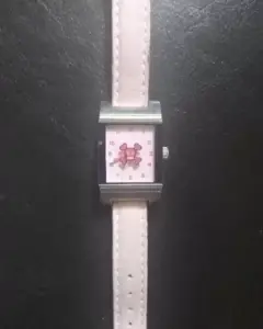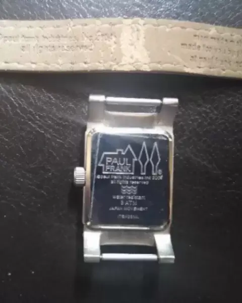 Reloj Calaverita Paul Frank. Reloj de cuarzo, con impresión de calaverita en cristal, de colección de la marca Paul Frank, carátula rectangular de acero inoxidable con correa de piel en color rosa pastel*Medidas: Carátula 3x2cm. Largo 21cm*Detalles: La correa está descarapelada sólo por dentro, por fuera intacta, carátula sin rayones*Calificación: 9*NO OFERTAR NI BLOQUEAR ARTÍCULO SI NO ESTÁS SEGURA DE LA COMPRA*GRACIAS*