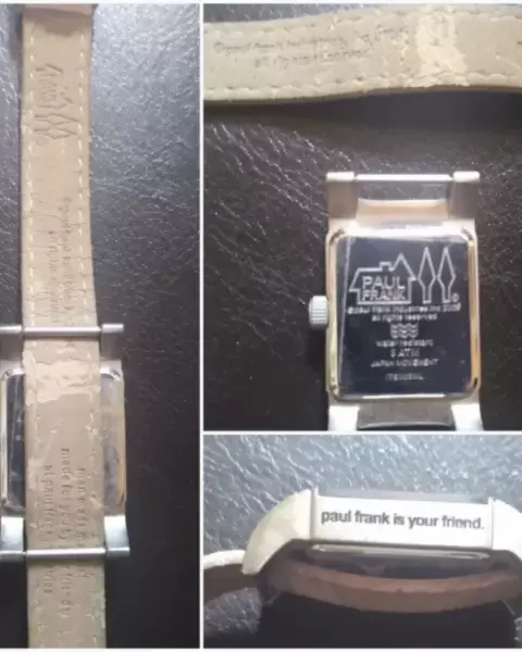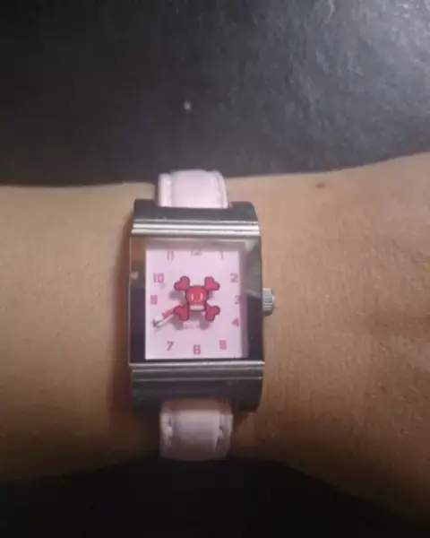 Reloj de cuarzo, con impresión de calaverita en cristal, de colección de la marca Paul Frank, carátula rectangular de acero inoxidable con correa de piel en color rosa pastel*Medidas: Carátula 3x2cm. Largo 21cm*Detalles: La correa está descarapelada sólo por dentro, por fuera intacta, carátula sin rayones*Calificación: 9*NO OFERTAR NI BLOQUEAR ARTÍCULO SI NO ESTÁS SEGURA DE LA COMPRA*GRACIAS*