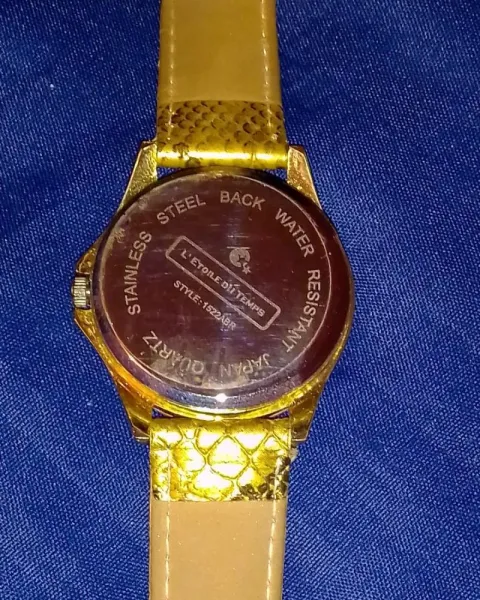 Hermoso reloj imitación piel de serpiente color Dorado, no esta rallada la caratula y funciona muy bien, solo lo utilice en pocas ocasiones el unico detalle esta un poco maltratado de la parte de atras del extensible , no afecta y no se nota ya que es donde va el broche y se tapa falta pila y cuenta con su caja.