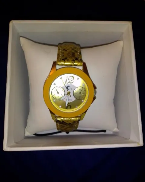 Reloj Chic Dorado Piel. Hermoso reloj imitación piel de serpiente color Dorado, no esta rallada la caratula y funciona muy bien, solo lo utilice en pocas ocasiones el unico detalle esta un poco maltratado de la parte de atras del extensible , no afecta y no se nota ya que es donde va el broche y se tapa falta pila y cuenta con su caja.