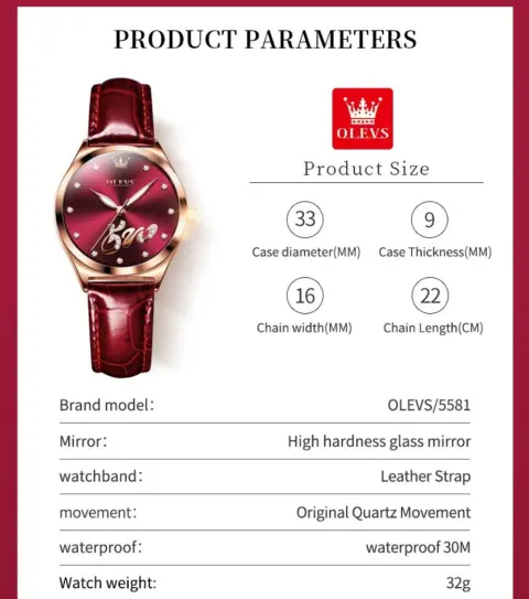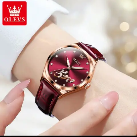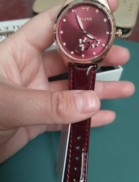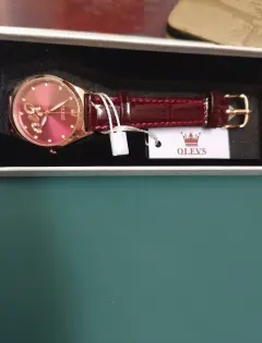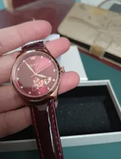 Encantador reloj color cereza, reloj de cuarzo, la correa es de cuero, muy resistente. Es contra el agua. Esta completamente nuevo.