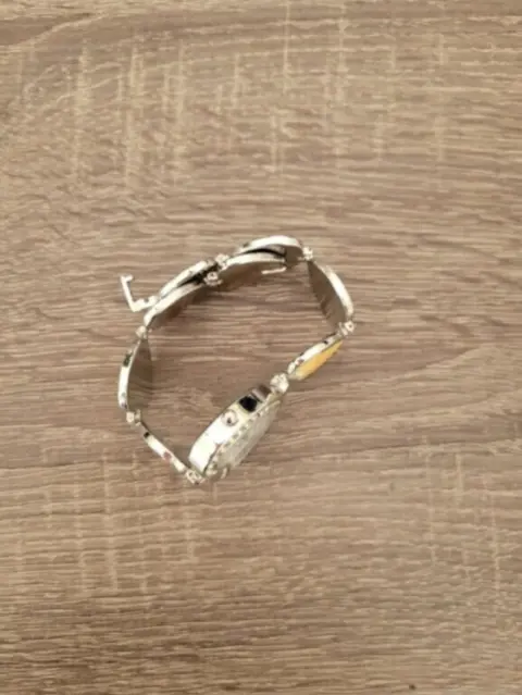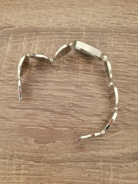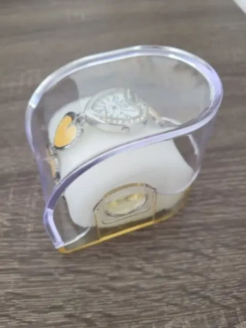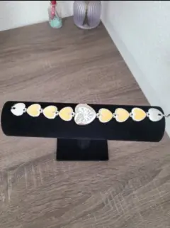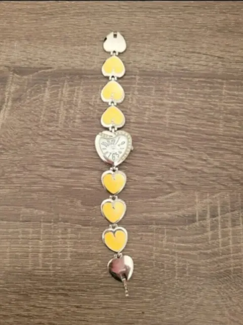 Reloj Corazon Fashion Acero Inoxidable, color amarillo y plata, pulcera de corazones en color amarillo, fondo blanco con numeros negros y accento de piedras en la orilla, funciona con pilas, cierre de broche de precion, nuevo a estrenar trabajando bien