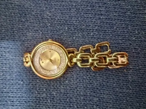 Reloj dorado, para dama, único defecto se le cayeron brillos internos pero no afecta si funcionamiento, exelentes condiciones, sirve de correa