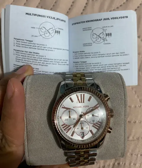 Reloj de dama. Lindo reloj analógico marca MK ORIGINAL de dama en tono Plata y oro rosado el cual es acero inoxidable, fue ligeramente usado no tiene detalles funciona perfecto en las fotos se muestra tal cual!