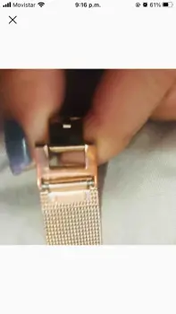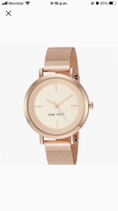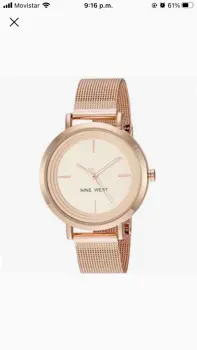 Reloj de pulsera de malla. Lindo reloj en color oro rosado marca Nine West de acero inoxidable. Lente de vidrio con eslabones ajustables. Tiene dos pequeños detalles, uno alrededor del lente del lado derecho se rayo ligeramente y también de uno de los eslabones por la parte de atrás pero ambos detalles son poco visibles (en las dos ultimas fotos se pueden ver los detalles).