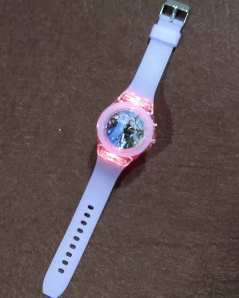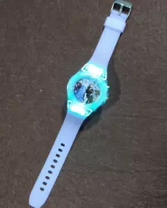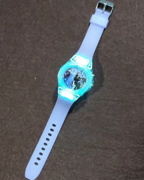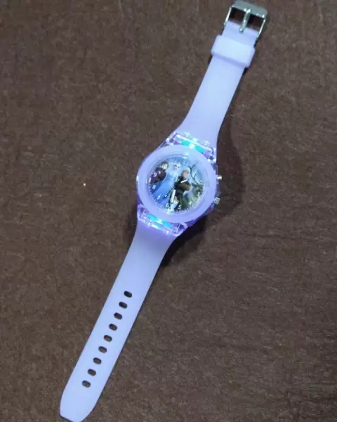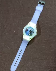 Reloj Frozen. Reloje analógico con lucesMaterial: siliconaLleva dos baterías de botón dentro (uno es responsable de la necesidad de iluminación, y el otro de la hora)Para la emisión de luz se pulsa el primer botón del reloj.El reloj encenderá la luz durante unos segundos.La luz cambia de colores.