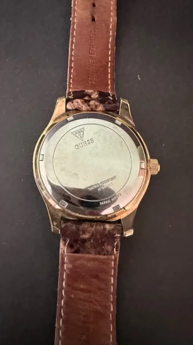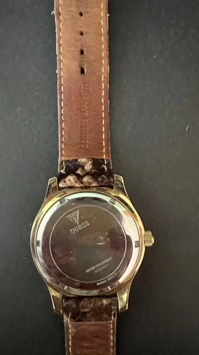 Padrisimo reloj Guess con brillos alrededor de la caja , con extensible de piel imitación víbora café , indica el día de la semana, el día del mes, da la hora en formato de 12 y 24 horas, usado.