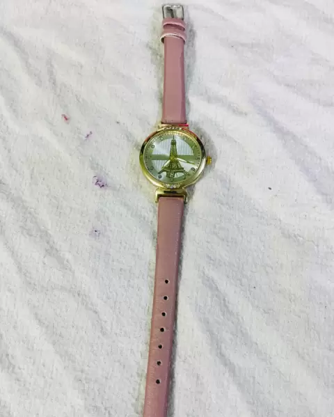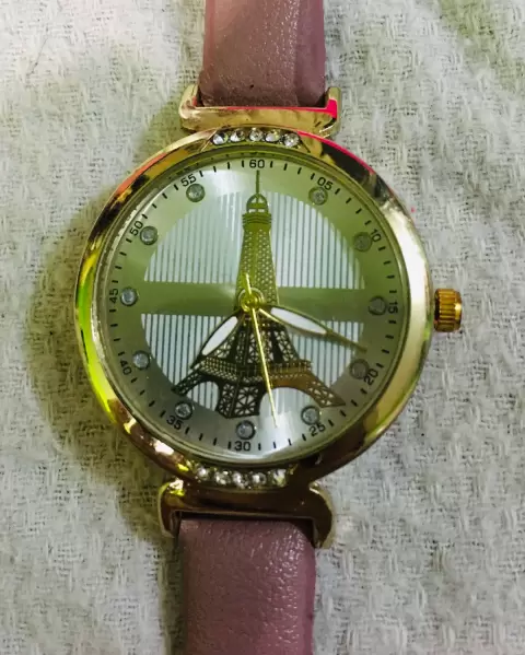 Reloj juvenil Torre Eiffel. La caja del reloj tiene La torre Eiffel De fondo y en cada hora en vez de encontrarse un número se puede observar incrustado una piedra de Swarovski y en la parte superior de cada piedra se encuentran los segundos den cinco en cinco. Caja de acero inoxidable Bañado en color oro (ojo no es baño de oro) tiene cuatro incrustaciones de Swarovski a los lados. La correa es de piel sintetica.