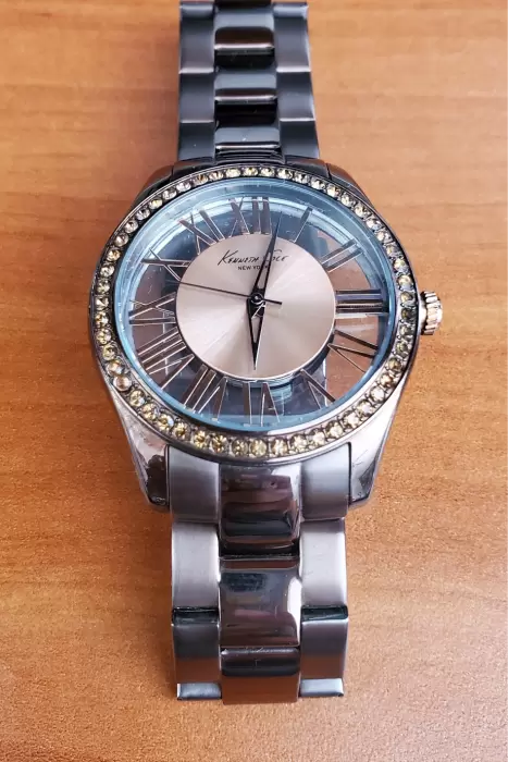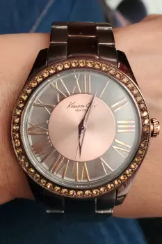 Reloj Kenneth Cole Café. Bonito Reloj Kenneth Cole , es color café, la carátula mide 4cm , el extensible incluyendo la carátula mide 23cm , el ancho del extensible es de 2cm, como detalle tiene unas piedritas que se hicieron de diferente color , no es muy notorio , se puede ver en las fotos y los rayones normales de uso. Se envía solo el reloj.