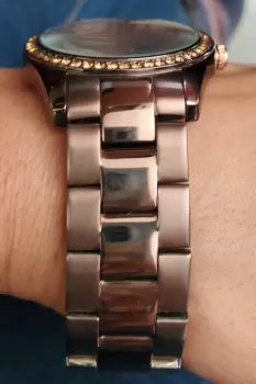 Bonito Reloj Kenneth Cole , es color café, la carátula mide 4cm , el extensible incluyendo la carátula mide 23cm , el ancho del extensible es de 2cm, como detalle tiene unas piedritas que se hicieron de diferente color , no es muy notorio , se puede ver en las fotos y los rayones normales de uso. Se envía solo el reloj.
