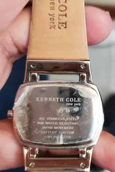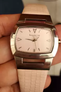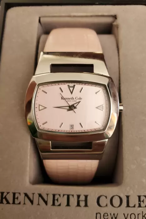 Reloj Kenneth Cole Rosa. Bonito reloj , se envía con pila, su estuche , esta en buen estado con detalles de uso como rayones ligeros en la parte de metal y 2 manchas por la parte de adentro del extensible, La caratula mide 3cm de largo x 2cm de alto.